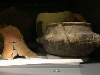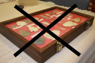 Many regional museums receive donations of archaeological artifacts from private local collectors. These collections are often housed inappropriately: archaeological objects are stored loosely in a single box or housed in portable “exhibit boxes.” Such cases are often made of wood and glass, and/or lined with foam that is not “archival” (and may off-gas). If archaeological collections are received in these types of improper housings, at the very least the artifacts should be removed from the detrimental environments and individually stored inside archival quality boxes or containers. The glue used to affix items inside “exhibit boxes” is sometimes hard to remove, and some bits of backing can adhere to objects. Consult an expert or conservator regarding glue removal in order to prevent any further damage to archaeological objects.