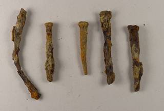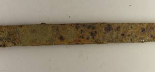 Metals that have been buried will be corroded with either thick layers that form a crust on the surface of the metal, or thinner more regular layers of corrosion. Typical archaeological metals include iron (wrought and cast), copper and copper alloys (brass and bronze), zinc, lead, and tin. The type and color of corrosion may give clues as to the type of metal beneath (e,g., copper corrosion is typically blue/green, while iron corrosion is usually yellow/brown/orange in color). Read more about types of meta Metal of the Object Materials page in the Collection ID Guide.