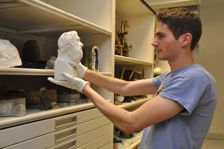 On the shelves and inside cabinets, there should be buffer layer between the shelf and the objects, a layer of acid-free tissue paper or polyethylene, for example. Items should be placed on shelves at safe distances from each other, so that access to each item is not impeded. Objects should not be stacked unless absolutely necessary. If stacking is unavoidable, a layer of inert foam or acid-free tissue should be placed in between objects to avoid damage from contact. Lids, pedestals, and other removable parts should be stored next to their items. Heavy objects should only be stored on shelves that are easily accessible -- ideally at waist- or cart-level, so that they are less difficult to retrieve from shelves. If open shelving is being used for object storage, items can be placed in archival boxes or acid-free tissue can be draped or wrapped around items to minimize dust accumulation and reduce the need for cleaning. Never let the width of an object protrude past the width of a shelf. Do not store large items that do not fit on the shelves directly on the floor -- use risers to prevent the item from coming in contact with the floor.